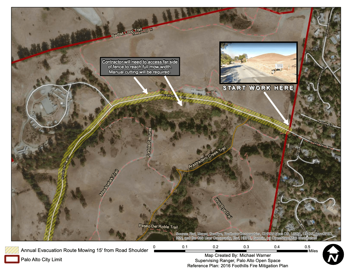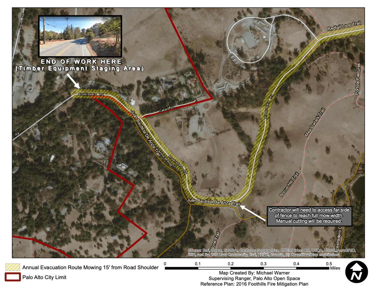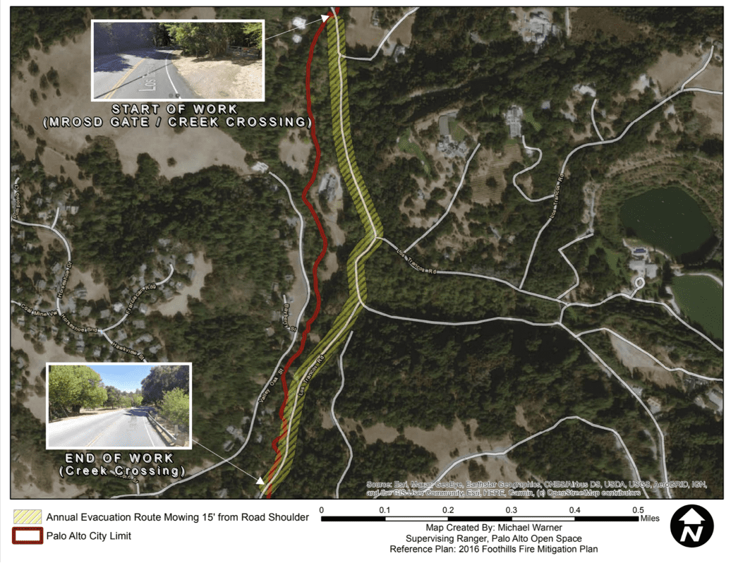 Santa Clara County Fire Safe Council and the City of Palo Alto are collaborating to complete a roadside mowing clearance project on Arastradero Road and Los Trancos Road, located in the foothills of the Santa Cruz Mountains west of Highway 280. This annual project enhances fire resistance along the evacuation route by reducing vegetation in the corridor and supports safer travel in emergencies.